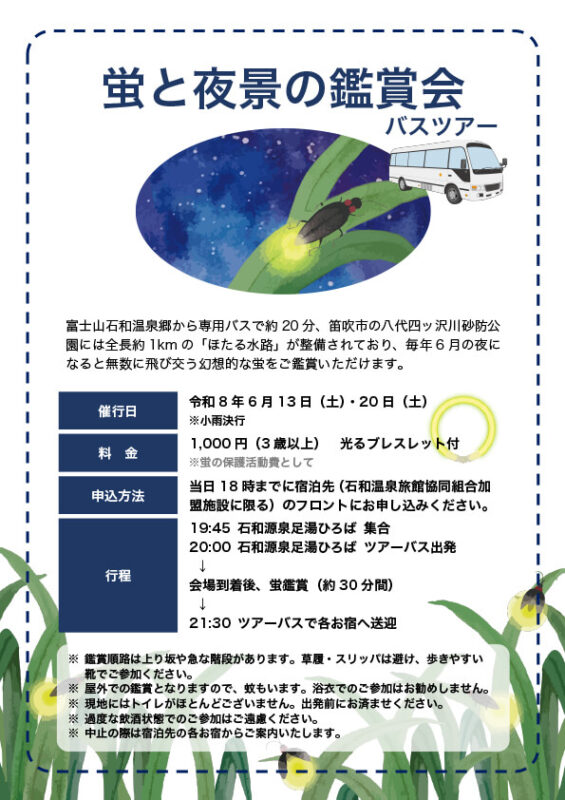 ※当日の天候・気候などにより、蛍が見られる数が変わることもありますのでご了承ください。